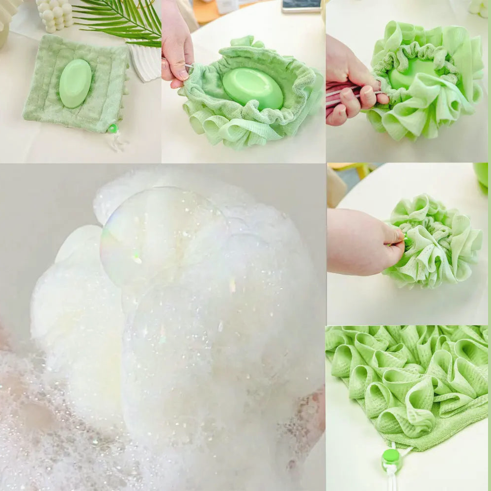 💡 Anwendung: Seife in den Schwamm legen und am Zugband vorsichtig ziehen, damit sich die Seife gleichmäßig verteilt. Schon hast du ein praktisches Peeling- und Reinigungstool für ein rundum erfrischendes Duscherlebnis!