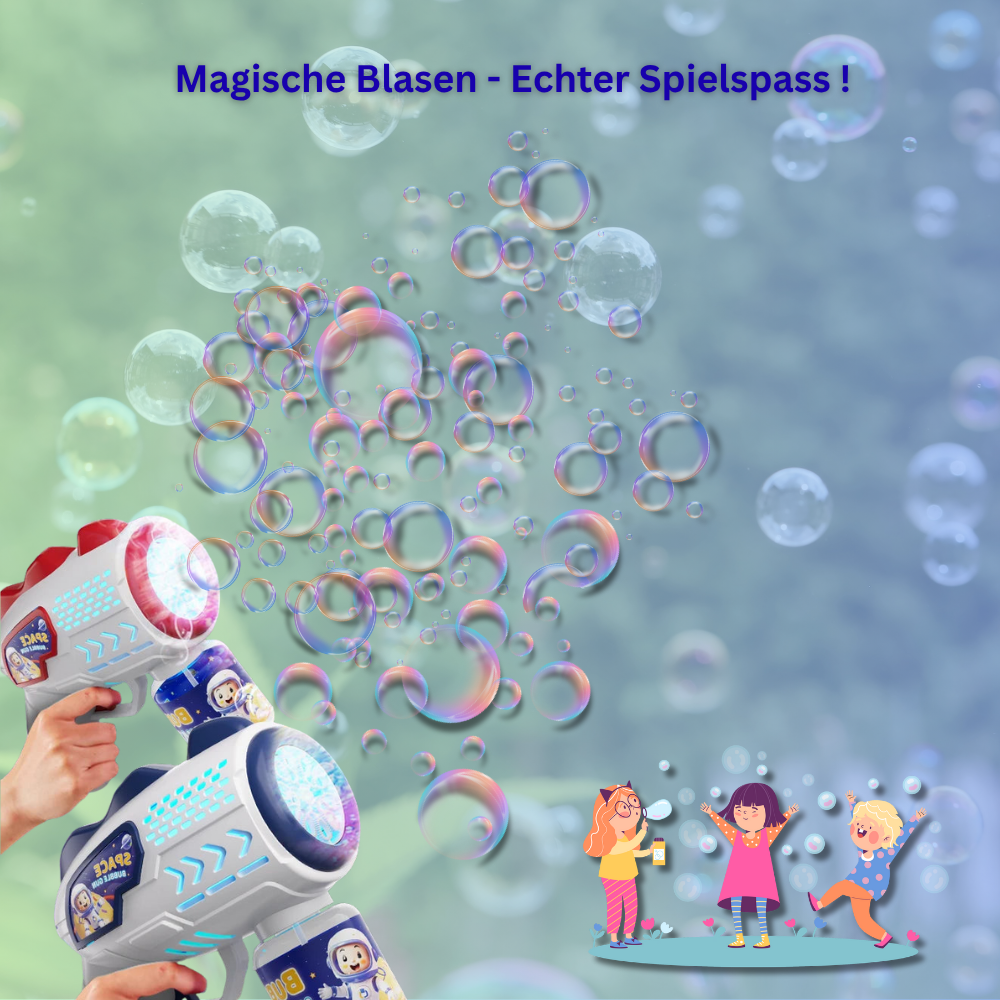 Mach dich bereit für ein sprudelndes Spektakel! Die BlubberRakete™ ist kein gewöhnliches Spielzeug – sie ist eine automatische Seifenblasenmaschine , die mit einem Knopfdruck Hunderte funkelnde Blasen in die Luft schiesst.